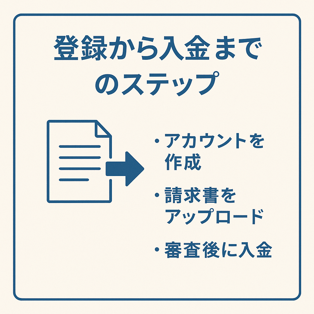 ãã€ãããŒã®å©çšã¯ãšãŠãç°¡åã§ãããŸããå ¬åŒãµã€ãããç¡æã¢ã«ãŠã³ããäœæããæ¬äººç¢ºèªãæžãŸããŸããæ¬¡ã«ãååŒå ã«çºè¡ããè«æ±æžããŒã¿ïŒPDFãç»åïŒãã¢ããããŒããAIãèªåã§å 容ã確èªããæ°åãæ°æéã§å¯©æ»ãå®äºããŸããæ¿èªãããã°ãæçã§å³æ¥å ¥éãè«æ±æžã10äžåãªããææ°æãåŒããéé¡ãæ¯ã蟌ãŸããŸããå¥çŽæžãå°éãéµéãªã©ã¯äžåäžèŠããªã³ã©ã€ã³å®çµã§ãã¹ããã§ãæäœã§ããŸããæ¥ãã®è³é調éã§ãã¹ãã¬ã¹ãªãå©çšã§ããç»é²åæ¥ããå ¥éãããã±ãŒã¹ãçãããããŸããã